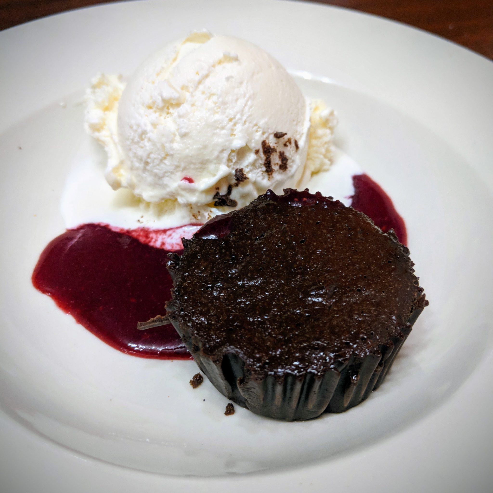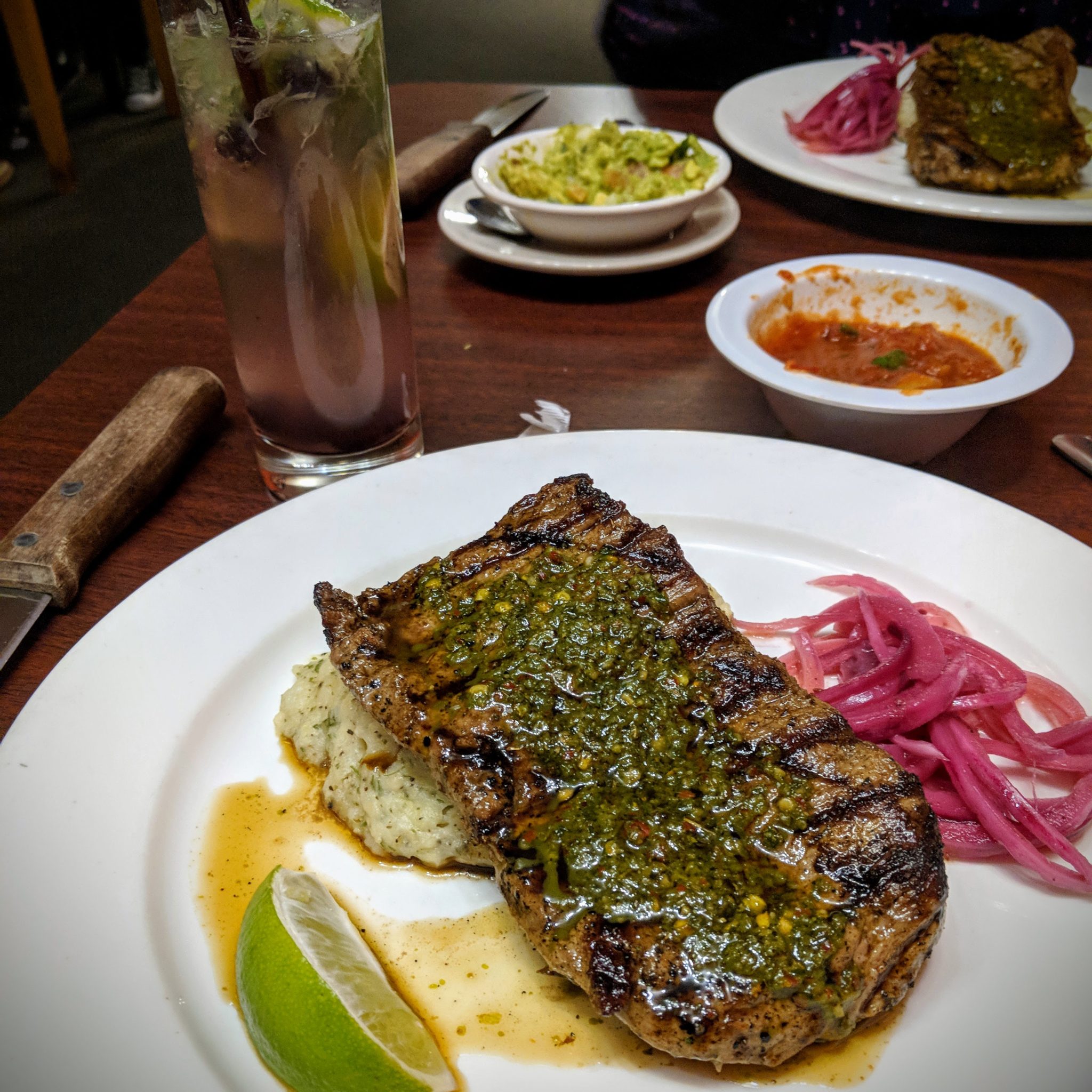 We have been to both of the Downtown Soup and Taco locations and have always enjoyed their Mexican cuisine. Their menu was $20.18 for a three-course meal including appetizer, entree, and dessert. Chips and salsa were included, and we added their amazing guac and a couple of adult beverages (after all this was a rare date night). My wife got a blueberry mojito, and in her words, “one of the best drinks I’ve ever had!” It was good! I decided on chicken corn chowder soup, and she got the romaine salad with cranberries and fried banana chips. Both were excellent and just the right amount for us to split. We both chose the steak with chimichurri sauce over garlic mashed potatoes accompanied by pickled onions. I wasn’t sure what to expect from a steak at a Mexican restaurant. Usually, I go with tacos or enchiladas. All I can say is “WOW!” The steak was amazing and probably one of the best steaks I have ever had in Fredericksburg. I highly recommend you get out this week and try their steak as it isn’t on their regular menu. (We asked three different people to have them add it to their menu!) After finishing the steak, I was stuffed and had completely forgotten about the flourless chocolate cake with ice cream and raspberry sauce that was on its way. I figured out a way to make room, and it was the perfect ending to a perfect meal!