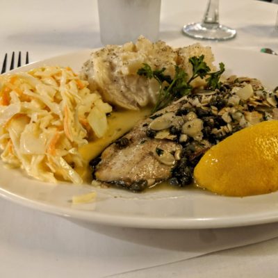 Today I headed to one of my favorite local restaurants, La Petite Auberge, to sample their incredibly priced lunch for $10.18. I wasn’t sure what to expect at this special price point.  All of the meals started off with a house side salad with their homemade dressing, and it was a great starter. I was excited to find a variety of entree options and had trouble deciding between the trout with almonds and capers or the flank steak bearnaise. The waiter recommended the trout and said it was one of his favorite items on their menu. I was impressed throughout the meal that every time I said “thank you”, it was followed by a “my pleasure” from the waiter.  It was a nice touch, and the service from beginning to end was superb. Now, back to the trout! It was great, just like the waiter had described.  It included delicious scalloped potatoes and a side of coleslaw.  They really went above and beyond with what they included for the $10.18, and I highly recommend you make La Petite Auberge one of your stops this week.